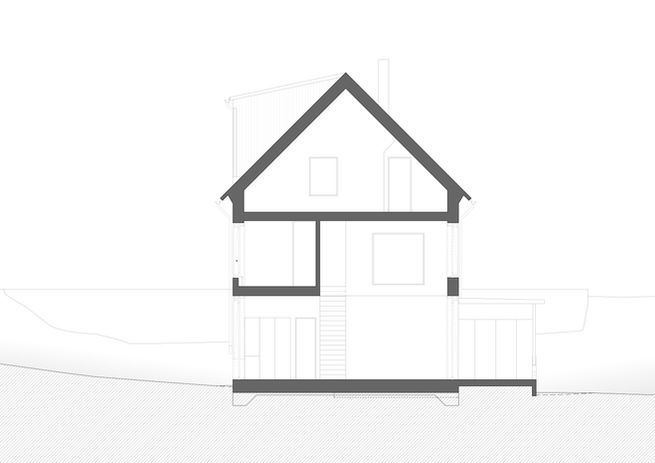 Im Innern überrascht eine lichtdurchflutete Atmosphäre. Vom Eingangsgeschoss, in dem die Arbeitsräume und das Gästebad liegen, führt eine Treppe nach unten ins Wohngeschoss mit dem überhohen Essbereich, der Küche und dem offenen Cheminéezimmer. Eine zweite Treppe liegt im zweigeschossigen Entréebereich und erschliesst die privaten Räume im Dachgeschoss. Unter dem Giebeldach liegt das eindrückliche, an einen Zeltraum erinnernde Schlafzimmer mit Ankleide. In der überhöhten Gaube ist das Badezimmer situiert. Die großen Fenster ermöglichen nicht nur eine optimale Belichtung und Besonnung, sondern bieten auch von allen Zimmern interesssante Ausblicke in die weitgehend unbebaute Natur.