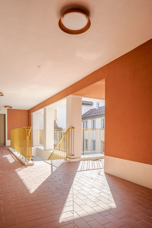 Die schmucke Fassade ist elegant repräsentativ und zeigt an der Hauptgasse ein modernes Gesicht, dagegen ist der rückwärtige Hausteil zum Hof in seiner Gestalt profaner. Hier gelangt man zu den Wohnungen der oberen drei Etagen. Verlässt man im zweiten Obergeschoss das hintere Treppenhaus, betritt man eine grosse Dachterasse mit einer Laubengangerschliessung für die oberen Geschosse. Da private Balkone fehlen, bilden sie den kollektiven, familiären Aussenraum für die 11 Wohnungen. Im zweiten Obergeschoss sind vier individuell geschnittene Wohnungen mit streng gegliederten Wohnräumen zur Kapellgasse und einer informelleren Seite zum Hof situiert. Im dritten Obergeschoss reichen Maisonettewohnungen bis unters Dach.